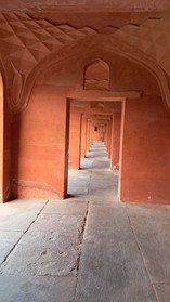 Here we are looking from the Taj back towards the main gate. The entrance gate to the Taj Mahal has 22 cupolas on top of the gate, two rows of 11. This is the only angle (second pic) from which you can see all 22. Colonnades run off the gate in a square. The small 'rooms' in the colonnades were where the workmen lived and worked. Bear in mind that the craftsmen (and yes, they were all men) would come from all over India and they had to be accommodated for 20+ years. These small rooms are empty now but imagine them being filled with marble masons, gem cutters and builders.