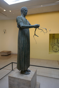 ... but probably the most signficant and most well known by Greeks is the Charioteer. It's the only remaining bronze figure from the temple, the many others have been melted down for coins or tools or weapons, or stolen and moved elsewhere. The Charioteer survived because it was buried under a rock-fall at Delphi. It shows the young man after the chariot race, when he's victorious. A few pieces of his chariot also survived. Those of you into fashion will recognise the style of garment (lots of pleats!) that designers created, called the Delphos, after this statue.