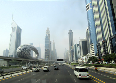 Amongst the shiny, vertical, streamlined skyscrapers, one building stands out: the Museum of the Future. It's extraordinary. The words in Arabic calligraphy are actually windows; the words were written by the Dubai ruler and relate to Dubai's future. The shape is a torus, like a doughnut. But this ain't no doughnut.