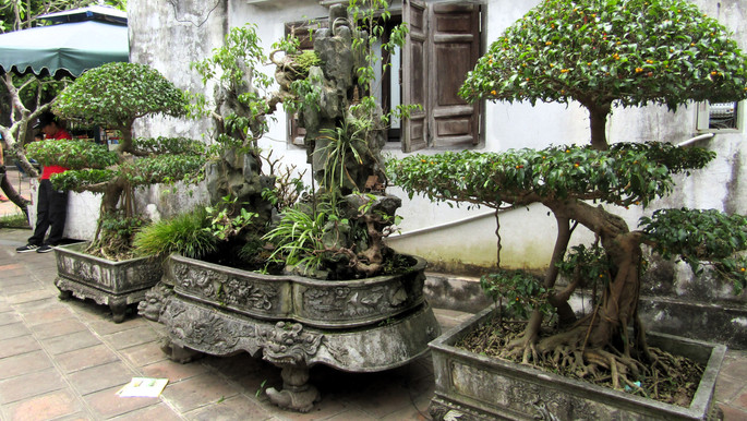 The One Pillar Pagoda next to the mausoleum was a nice change of scene. The pagoda on top of the pole (pillar) represents a lotus flower; the yellow fruit offering at the shrine is called Buddha's hand because it looks like, well, fingers. It's pretty but inedible. Also very pretty were all the bonsai trees wherever we went!