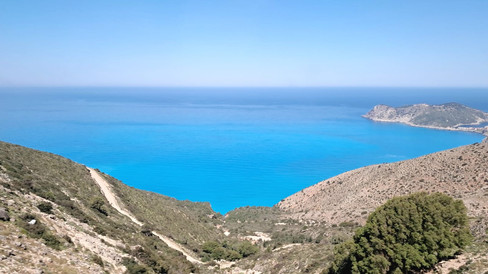 But wait, there's more stunning blue beauty! Myrtos Beach is one of Greece’s top ten beaches. We could only admire it from the clifftop. (We think that one reason it's so highly rated is that it's extremely difficult to reach! It's very unlikely to be overcrowded.) Apparently the colour of the Bay of Myrtos changes with the time of day. We were obviously there at turquoise o'clock.
